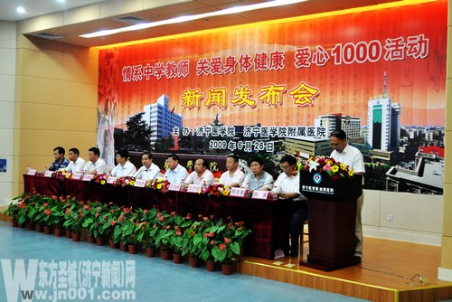 本网6月26日讯(记者 张立英) 今天下午,“情系中学教师,关爱身体健康,爱心1000”活动新闻发布会在济宁医学院附属医院举行。济宁医学院党委书记、附属医院院长武广华教授向出席发布会的各媒体记者介绍了“情系中学教师,关爱身体健康,爱心1000”活动的基本情况,并现场为参会的部分教师代表发放了健康体检证。市教育局副局长刘加庚教授到会并讲话,发布会由济宁医学院院长白波主持。