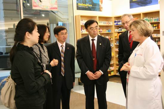 图三 白波院长(右三)在George博士(右二)陪同下参观麻省医药学院模拟药房