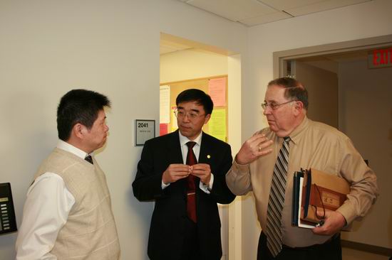 图四 白波院长(中)与北卡罗来纳大学教堂山分校James博士(右一)交流