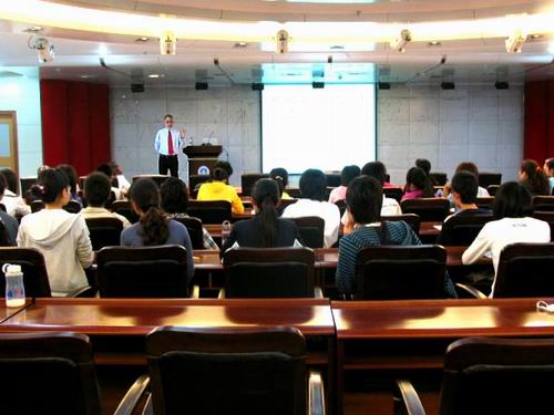 6月3日下午,日照校区主楼二楼学术报告厅座无虚席,Dr. Marc Kasner 向在座的200余名师生介绍了蒙特克莱尔州立大学的概况及化学与生物化学系的建立及现状,通过大量的图片生动形象地展现了美国学生上化学实验课的情景。6月4日上午,候士峰博士做了《纳米技术在分析及生物医学中的应用》讲座,在讲座中,他以石墨为例,深入浅出介绍了纳米技术的概念、研究进展及在生物医学中的应用前景,特别是纳米技术在生物医学中作为药物传输系统载体的应用。随后,Dr. Marc Kasner做了《以计算机分子模拟来研究α,β-吡喃葡萄糖的结构》的报告。在报告中,Dr. Kasner 为广大师生介绍了他的在研课题,用计算机分子模拟技术研究葡萄糖在人体吸收过程的结构变化和能量变化。