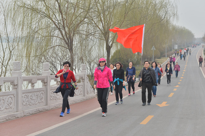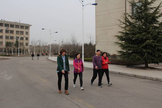 在济宁校区,参加健步走的女职工们从学校东大门出发,集体步行至太白湖千禧阁广场,沿鼎湖路、五岔口、石佛路到太白湖景区正门,一直健步走回学校东大门。一路上,大家沐浴着初春的明媚阳光沿湖东行,