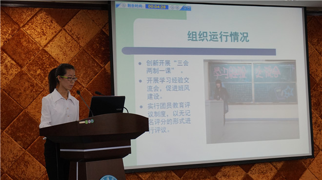 会上,2014-2015学年两校区各学生优秀团支部从支部概况、组织运行活力、工作开展活力、团员参与活力、学风建设及创新典型案例等方面,以PPT形式依次进行了交流展示。交流展示结束后,教师评委和学生评委根据活动开展情况及汇报情况进行了现场打分。