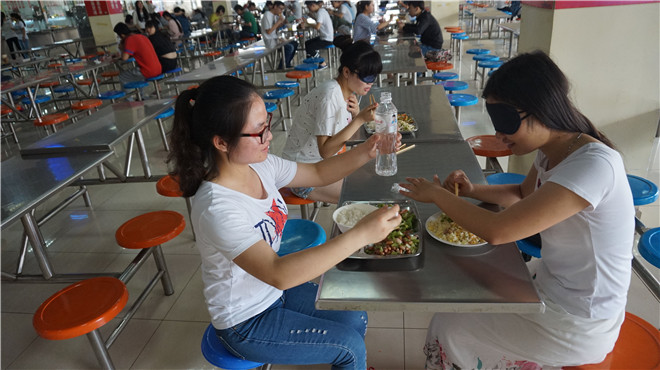 体验活动中,体验者蒙上自己的双眼,体验失去阳光的艰辛,由辅助者引导,完成在校园内徒步走,感受在黑暗的世界中每走一小步都要付出比正常情况下更多的努力;进入餐厅,完成买饭、吃饭等活动;进入宿舍,感受黑暗中的日常生活。