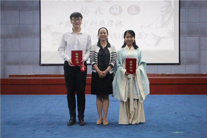 中医与全科医学院院长孙冰对比赛给予充分肯定和高度评价。她说,作为从事中医学高等医学教育的教师和中西医临床医学的学生,我们有责任也有义务做好中华民族传统文化的传承和弘扬。为了让同学们通过诵读经典练好中医基本功,将中医经典国粹传承下去,特策划了本次活动,并要将“诵我国粹,扬我国医”为主题的经典诵读活动一直办下去,争取办成中医与全科医学院的金牌活动。中医与全科医学院只有在大家的齐心协力下,才能做得更好,走得更远,才能给同学提供更好的学习和文化氛围,为国家为社会培养出更多更好的人才。