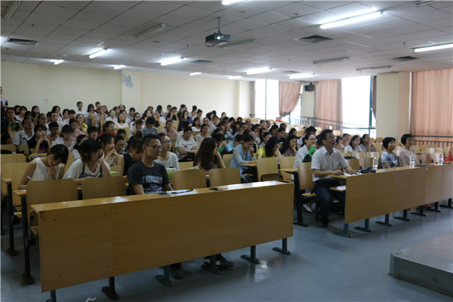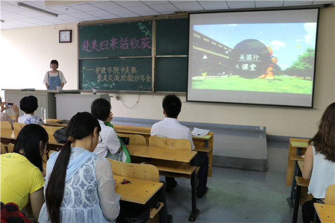 6月23日下午,护理学院中美班赴美交流经验分享会在教学楼309教室热烈举行。本次会议的主题是“赴美归来话收获”,护理学院副院长陈玉芹、刘鹏飞与2014级、2015级中美班130余名同学一起参与本次活动。