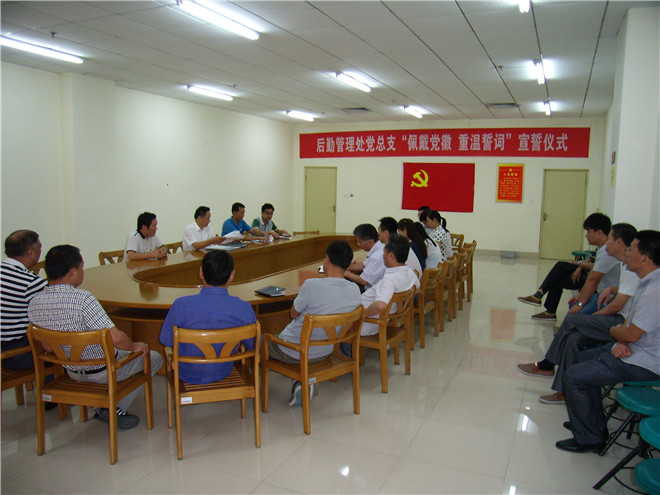 为深入开展“两学一做”学习教育,庆祝中国共产党成立95周年,6月28日,在后勤管理处会议室,后勤管理处党总支组织全体党员开展“佩戴党徽、重温誓词”宣誓仪式主题党日活动。全体党员佩戴党徽,面对党旗,高举右手,在党总支书记聂继雷的带领下庄严宣誓。