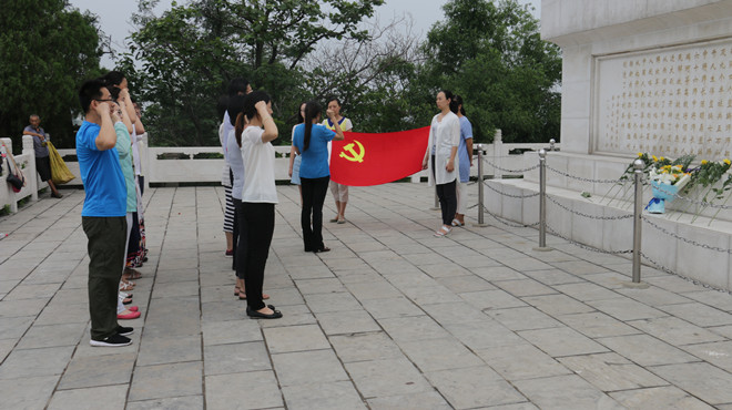 在革命烈士纪念塔前,全体党员佩戴党徽,重温了入党誓词。
