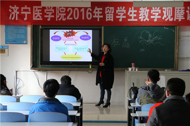 国际交流与合作部副主任朱荔芳主持了活动,药学院基础医学教研室的李丽和杜晶两位老师分别就《神经肌肉接头处兴奋的传递》、《发热》两个题目进行了示范授课。她们备课认真,英语口语表达流利、准确,讲授富有激情,板书与课件完美结合,内容全面、重点突出;注意加强课堂提问,引导学生们积极互动。在讲授知识的同时,两位老师还针对学习态度、学习方法、知识衔接等方面给予指导,受到学生们的好评。授课后,学生和老师们围绕本次观摩课及平时教学进行了热烈讨论,提出了意见建议,形成了共识。