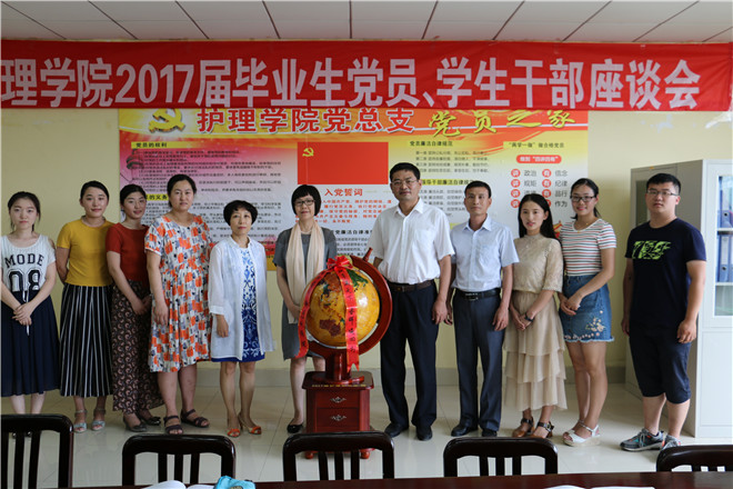 6月26日下午,护理学院2017届毕业生党员、学生干部座谈会在南实验楼217会议室举行。护理学院党总支书记高鸿、副书记副院长陈玉芹、副院长刘鹏飞,教育科、综合科负责人,毕业班辅导员及2017届30位毕业生参加座谈会。