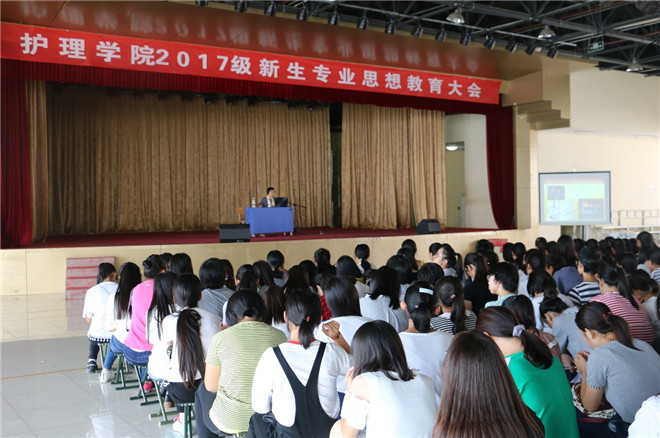 9月11日下午,护理学院2017级新生专业思想教育大会在大学生活动中心召开。护理学院党总支书记高鸿、党总支副书记副院长陈玉芹、副院长刘鹏飞、各科室负责人、教研室主任及2017级全体新生参加大会。