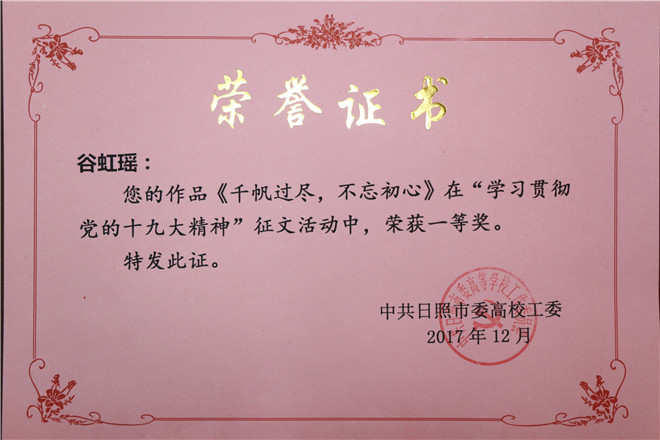 近日,日照市高校工委举办“学习贯彻党的十九大精神”征文活动,我校推荐的7部作品获奖。其中,《众说十九大,共筑中国梦》《千帆过尽,不忘初心》两部作品荣获一等奖,两部作品荣获二等奖,三部作品荣获三等奖。