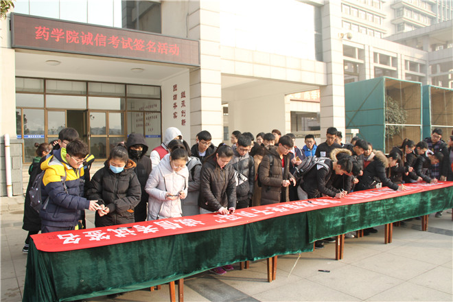 1月2日上午,药学院在药学实验楼前举办“倡导诚实文明风气,彰显济医学子风采”诚信考试签名活动。药学院领导班子、各年级辅导员、班主任参加活动。