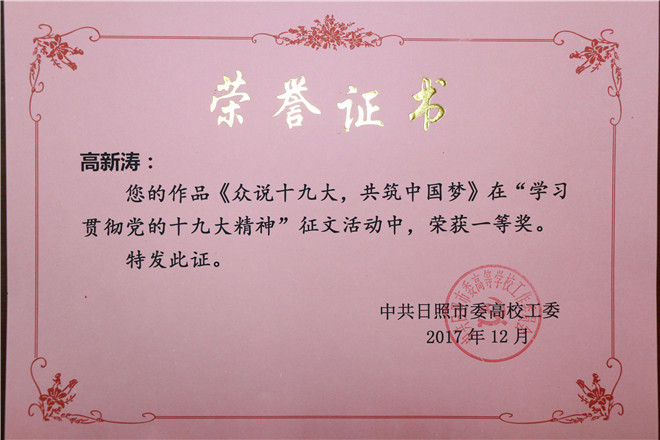 近日,日照市高校工委举办“学习贯彻党的十九大精神”征文活动,我校推荐的7部作