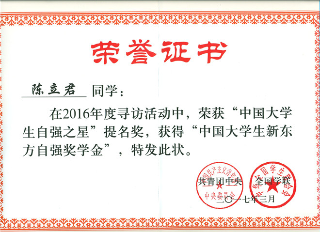 陈立君同学荣获2016年度“中国大学生自强之星”提名奖
