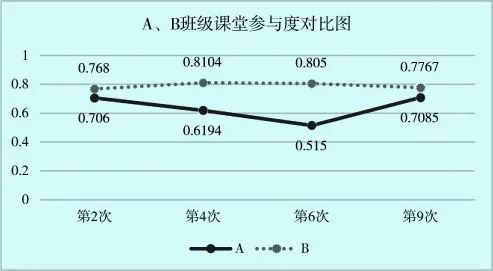 综上可知,在上述四次课程中,A班的课堂参与度均比B班的低,尤其是教师采用讨论为主的形式时,A班级的课堂参与度降低,B班级的课堂参与度提高。A班每次课程的线上线下综合参与度也均比B班低,平均分亦低。