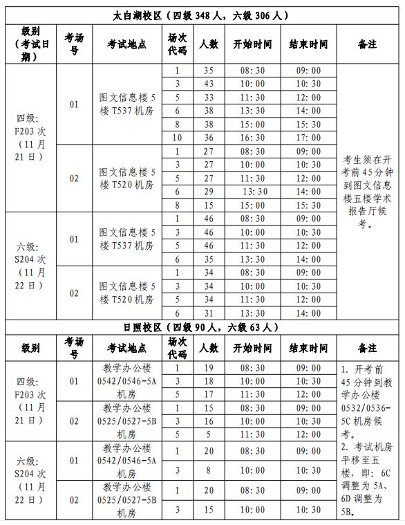 英语四级口语考试(CET-SET4)考试时间为 11 月 21 日(F203 次),英语六级口语考试(CET-SET6)考试时间为 11 月 22 日(S204 次),具体场次安排如下: