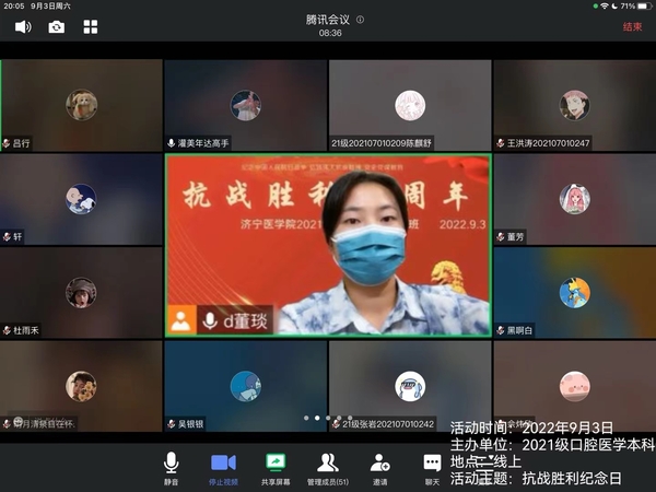 “四万万人齐蹈厉,同心同德一戎衣。”2022年9月3日是中国人民抗日战争胜利77周年纪念日,口腔医学院团总支组织各团支部开展主题团日活动。活动以线上形式展开。