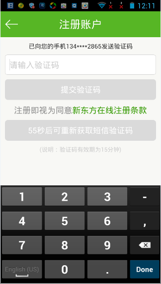 4、点击注册后,手机将获取验证码,输入验证码并提交。