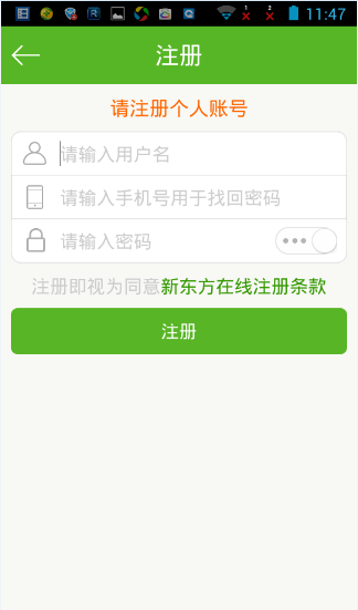 3、进入注册个人账号页面。输入希望注册的用户名、手机号、密码。点击注册。