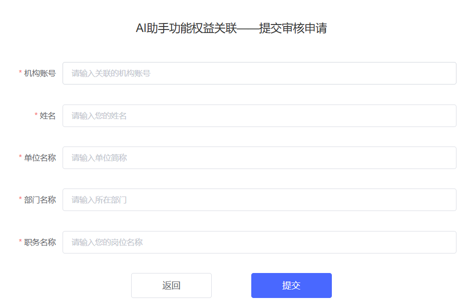 输入机构账号jnymyAI及个人信息提交申请,管理员审核通过后实现关联。