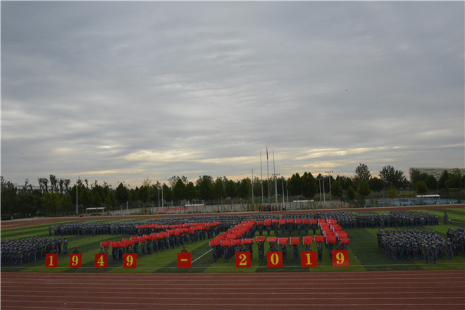 典礼在庄严的国歌声中开幕,全场的目光追随着冉冉升起的五星红旗,表情庄严而自豪。指挥员下达口令,参加军训的2019级新生进行分列式表演。受训新生军姿挺拔,迈着矫健的步伐,喊着响亮的口号正步通过主席台,接受检阅。新生代表还进行了军体拳、刀术、内务整理等精彩的军事训练表演,整套动作整齐划一、刚劲有力,以实际行动展示了军训的丰硕成果。队列摆出“1949-2019”“70”等字样,庆祝新中国成立70周年。