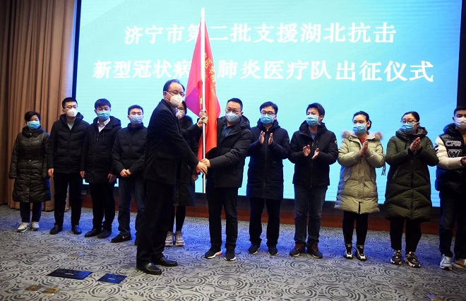 医疗队队长、呼吸内科副主任医师蒋胜华代表医疗队全体成员表示,一定发扬附院大爱无疆的精神,以过硬的专业技术和优质的服务质量在疫情防控第一线为附院和济医争光、为济宁添彩,坚决完成疫情防控任务,请家乡人民放心,早日传回捷报。
