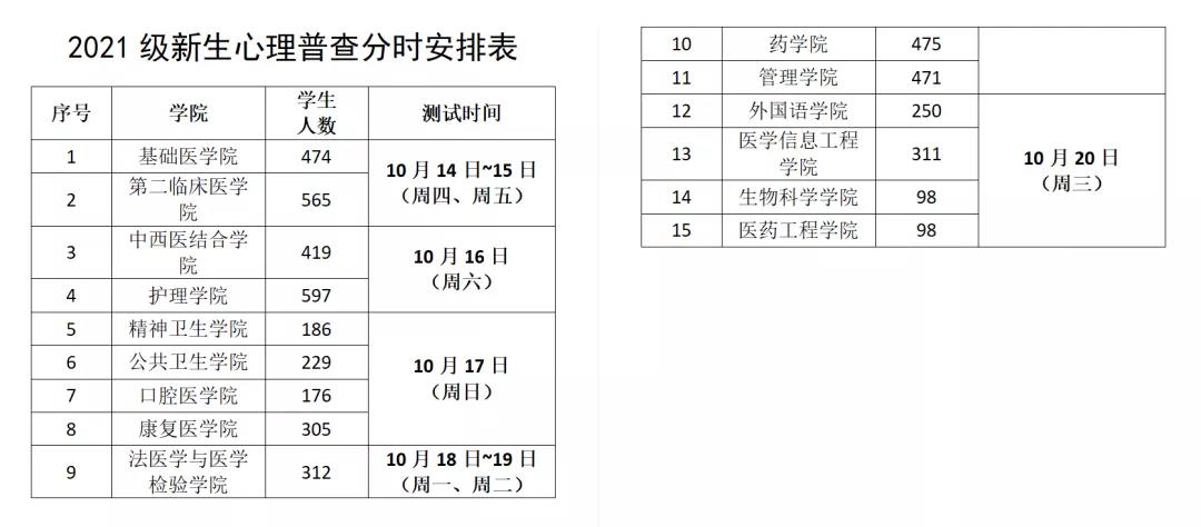1.2021级新生心理普查时间为:10月14日-10月20日,因系统容量限制,为保证心理普查工作顺利进行,避免学生集中登录,系统运行故障,各二级学院心理普查分时段进行,时间安排详情见附件,请各二级学院新生辅导员通知学生务必在规定时间内登录系统完成测试。