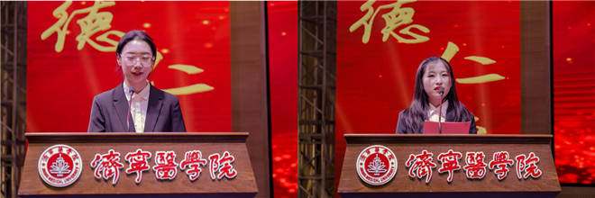 2019级精神医学研究生陈国庆、2019级临床医学本科学生丁奕文分别代表获奖学生发言。她们感谢学校的栽培和鼓励,并表示荣誉的获得代表着对她们过去成绩的肯定,是动力亦是鞭策,在将来的学习、生活和工作中将继续努力奋斗、开拓创新,带着济医人“明德、仁爱、博学、至善”的初心理想,在专业领域和人生旅途中砥砺前行,奋勇成才。