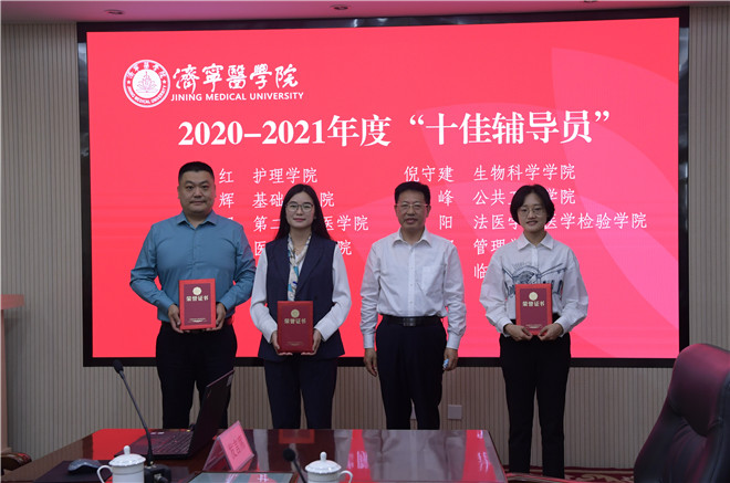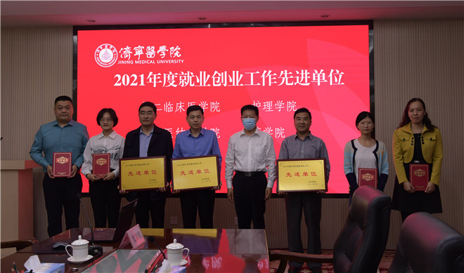 会上,姚庆强为2021年度就业创业工作先进单位、先进个人和2020-2021年度校级十佳辅导员代表颁发了奖牌和荣誉证书。赵敏宣读了《济宁医学院关于表彰2021年度大学生就业创业工作先进单位和先进个人的决定》和《济宁医学院关于表彰2020-2021年度十佳辅导员的决定》。第二临床医学院、护理学院、中西医结合学院、药学院获评2021年度大学生就业创业工作先进单位,马俊卿、马倩、王峰、王演艺、朱惠香、刘亚群、刘擎、杜现娟、李瑞琨、李燕、杨广伟、杨俊杰、谷昊明、张敏、陆辉、陈勇、孟阳、倪守建、彭军19名老师获评2021年度大学生就业创业工作先进个人,蒋红、谢辉、张东园、裘建宁、马倩、倪守建、王峰、孟阳、张丽娜、胡晓琳10名辅导员获评2020-2021年度校级十佳辅导员。基础医学院党委书记郭子林、第二临床医学院党总支书记高广志、药学院党总支副书记杨磊、生物科学学院学生管理科科长倪守建作为获奖代表与大家分享了各自工作的典型做法和成效。