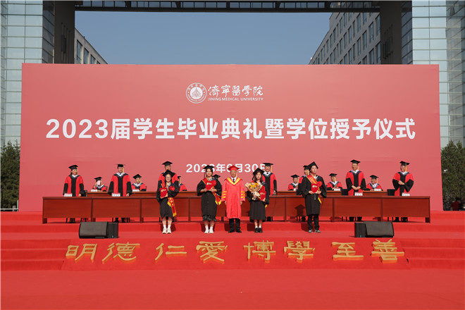 本次典礼共分回眸、感恩、启航三个篇章,在“回眸”篇章,全体师生共同观看了视频《回眸济医时光》,回顾在济医的点滴记忆和感动瞬间;在“感恩”篇章,毕业生代表胸怀感恩之心,向学校捐赠图书,向辅导员、教师、家长、后勤安保人员献花,表达对母校、师长和社会的感恩之情,校领导为毕业生代表赠送了毕业纪念品,为2023届校友联络员颁发了聘书;“启航”篇章为2023届学生毕业典礼暨学位授予仪式。