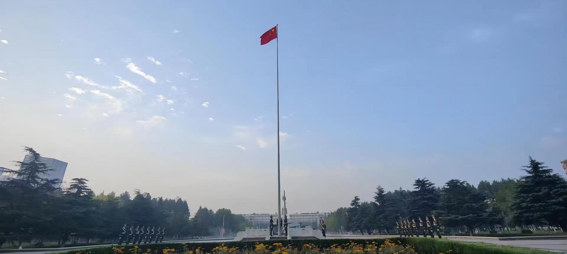 上午6时50分,晴空万里。国旗护卫队队员们目光坚定,踏着铿锵有力的步伐庄严地走向升旗台,伴随雄壮的《义勇军进行曲》,五星红旗冉冉升起,迎风飘扬,在场师生全体肃立,面向国旗行注目礼,表达对革命先烈深深的缅怀与崇高的敬意。