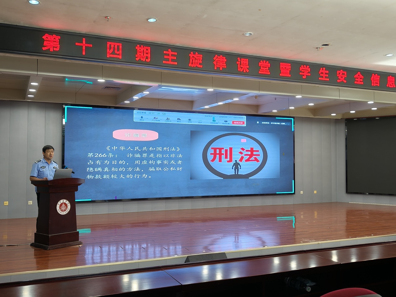 为应对毕业季网络电信诈骗高发态势,增强学生安全防范意识,提升学生安全信息员工作能力,6月11日,学校举办第十四期主旋律课堂暨学生安全信息员培训活动。日照市公安局警官徐健应邀来校主讲。