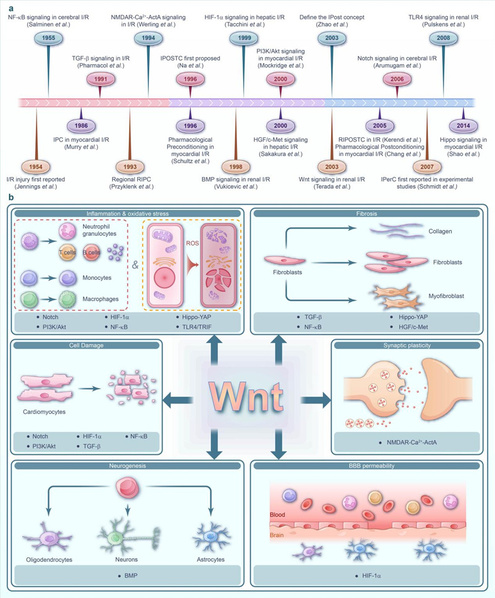 1月8日,苑金香教授团队联合徐州医科大学谭如彬博士,复旦大学附属中山医院、上海市心血管病研究所王时俊研究员、吴剑研究员,中科院动物研究所高飞研究员在Springer Nature旗下国际著名学术期刊《Signal Transduction and Targeted Therapy》(最新影响因子39.3)在线发表题为“Ischemia-reperfusion injury: molecular mechanisms and therapeutic targets”的高水平文章。我校为第一单位,科研处医学检验所张萌博士、临床医学院2019级本科生刘倩和2018级本科生孟慧为第一作者。苑金香教授、谭如彬博士、王时俊研究员为共同通讯作者。论文指出Wnt信号多个分支(传统的Wnt/b-catenin以及非传统的Wnt/PCP、Wnt/钙等)在缺血/再灌注损伤过程中各自发挥代偿性或者加剧损伤的的不同作用;并提出Wnt信号与多种重要信号通路(如Notch、PI3K/Akt、HIF-1a、TGF-b、NF-kB、Hippo-YAP、BMP、NMDAR-Ca2+-ActA、TLR4/TRIF、HGF/