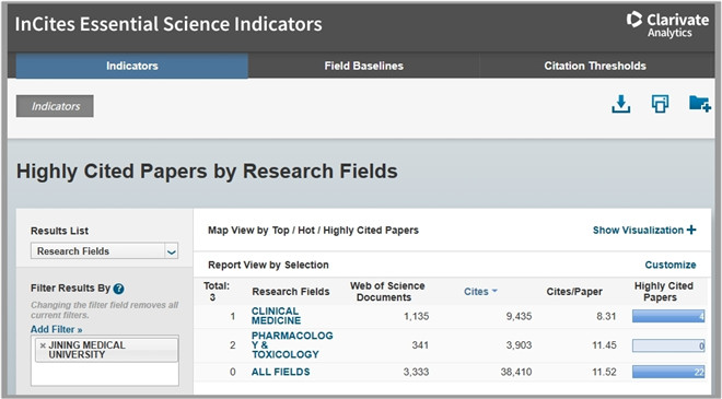5月11日,科睿唯安公司发布的ESI最新数据显示,我校“药理学与毒理学”学科进入ESI全球排名前1%。本期ESI 数据中,济宁医学院全球排名3463(上期排名3608)。Article 及 Review 论文3333篇,被引38410次,篇均被引11.52次,有 22 篇高被引论文,3 篇热点论文。我校药理学与毒理学学科首次进入ESI全球前1%,这是继2020年9月10日临床医学学科首次进入ESI全球前1%之后的又一突破。近年来,我校药理学与毒理学学科潜力值持续上升,跟踪监测显示,本期以0.082的最大涨幅跨越式进入ESI全球排名前1%,药理学与毒理学学科ESI论文341篇,被引3903次,篇均被引11.45次。我校临床医学学科自进入ESI全球前1%后,始终稳步提升,本期在进入临床医学ESI全球前1%的146所中国大陆高校中排名98位。ESI(Essential Science Indicators,基本科学指标数据库)是衡量科学研究绩效、跟踪学科发展趋势的基本分析评价工具,是对近十年SCI、SSCI论文及其引用情况进行统计和比较的计量分析数据库,按论文总被引次数排在该学科前1%的机构
