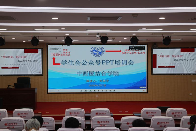 活动特邀优秀学子王绅妃和方芮平作为主讲嘉宾,吸引了近百名学子积极参与。两位嘉宾通过系统化的知识讲解与生动的案例分析,全面覆盖了公众号从选题策划到内容发布的各个环节,包括PPT制作技巧、文章润色方法、公众号发布流程,以及如何运用摄影技术为中医文化宣传素材创作助力等,为同学们开启了现代科技与传统医学结合的新视角。
