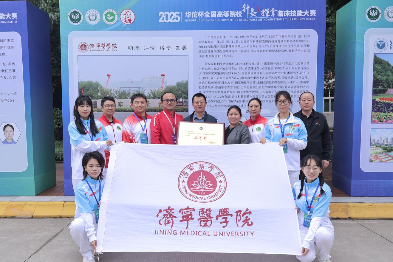 学院选派肖文怡、郑诗钰、高东瑞、贾姜涵四位同学组成学生代表队,济宁医学院附属医院袁冉冉、王亮,西苑医院济宁医院井傲、杜科伟四位老师组成临床教师代表队参赛。经过赛前两个月系统培训与充分准备,全体选手在比赛中沉着应对、稳定发挥,最终荣获团体三等奖,名列山东省参赛院校第二位。